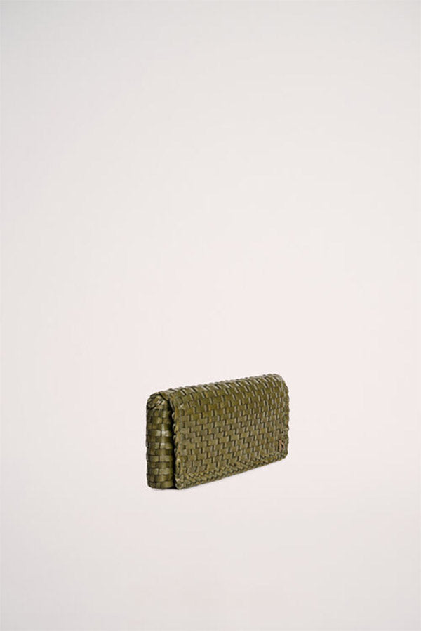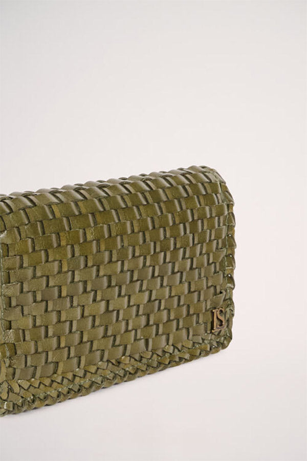 Handbag made of genuine woven leather. Embellished with a gilded metal "LS" detail. Made in Italy.