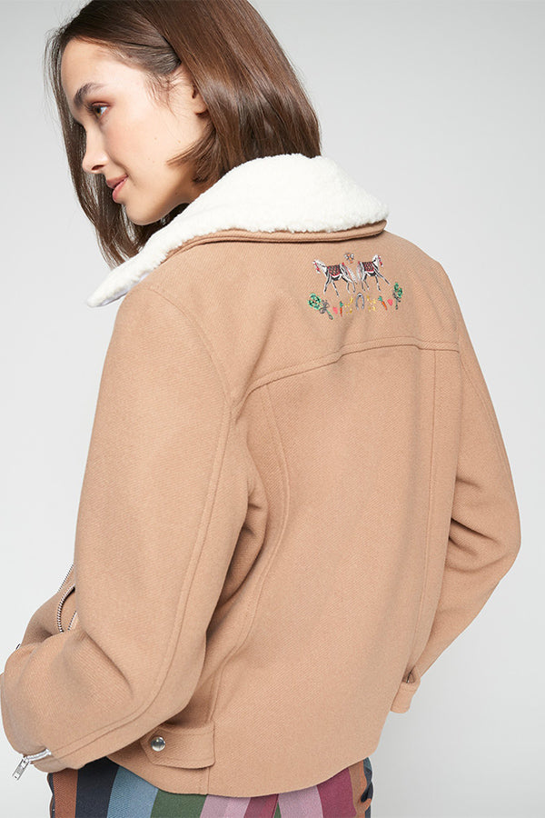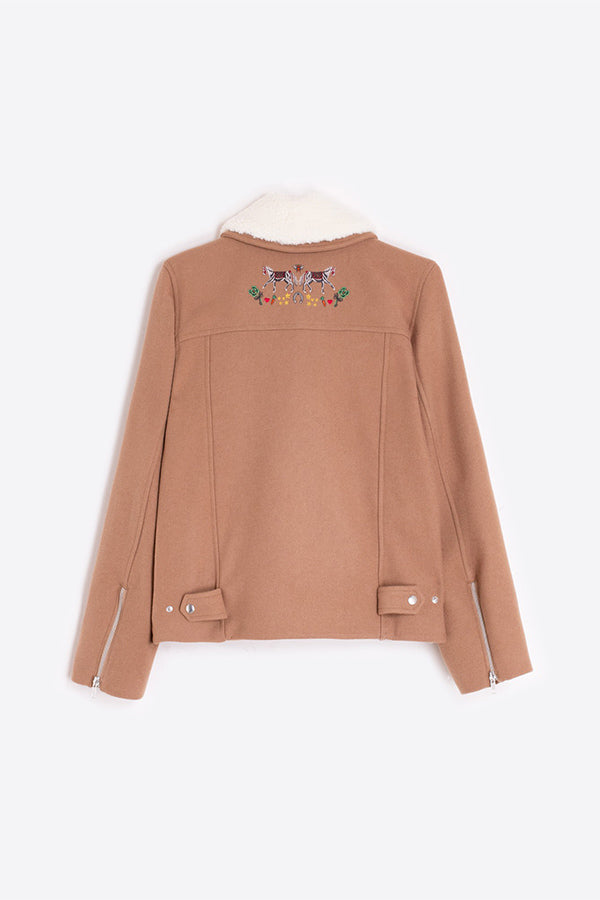 Short camel jacket with soft shearling-effect collar in white. Embroidered motif on the back with horses, horseshoes and stars. Features a front zip fastening with snap button placket, two zipped side pockets, and a flap chest pocket with metal button. Side straps at the hem for slight adjustment. Fully lined inner. Made of a wool blend.