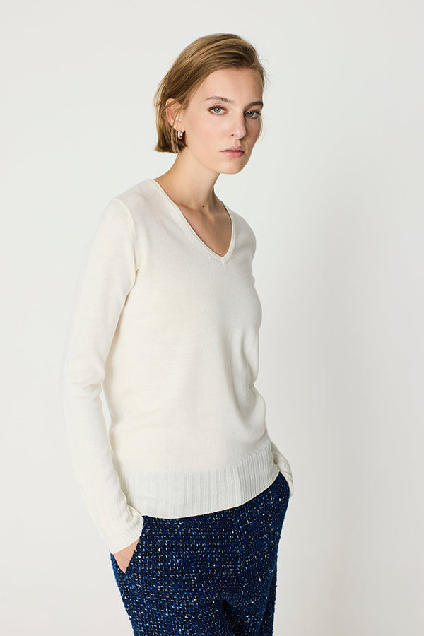 Fine wool V-neck sweater. Lightweight, soft, and perfect for everyday wear, with a unique ribbed detail. It combines style and comfort in a must-have item for your wardrobe.