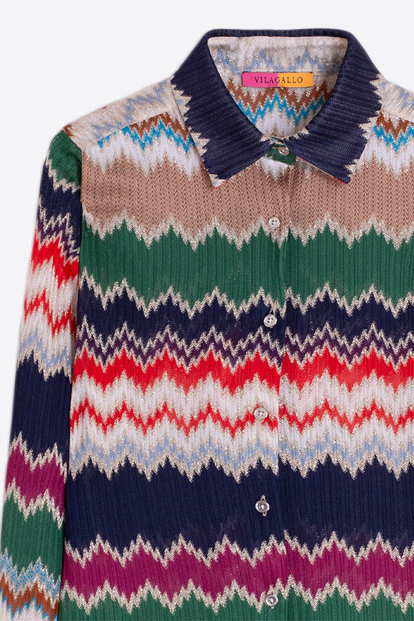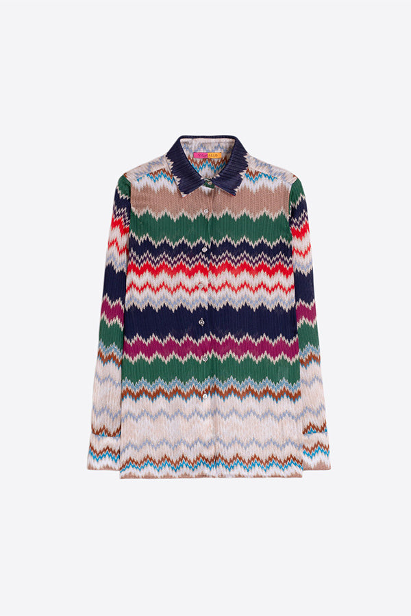 Jacquard shirt with a multicolour zigzag pattern in green, pink, beige and navy tones. Classic shirt collar, button-up front and long sleeves with buttoned cuffs. Straight cut.