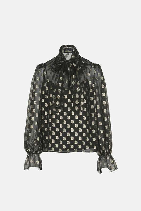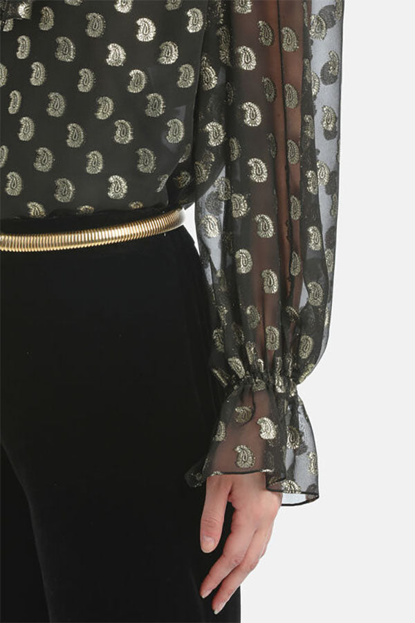 Elegant silk blouse with a lurex Paisley pattern. It features a tie-neck detail, gathered shoulders, and flounced sleeve hems. Integrated slip. Regular fit.