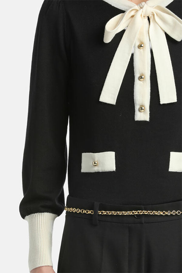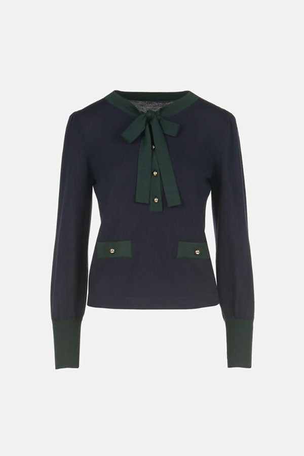 Bon ton pullover in plain-knit pure virgin wool. Trimmed with a bow detail at the neck, gold-tone dome buttons, flap pockets, and contrasting cuffs. Regular fit.