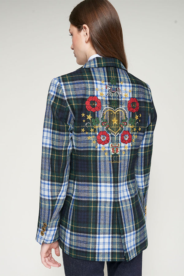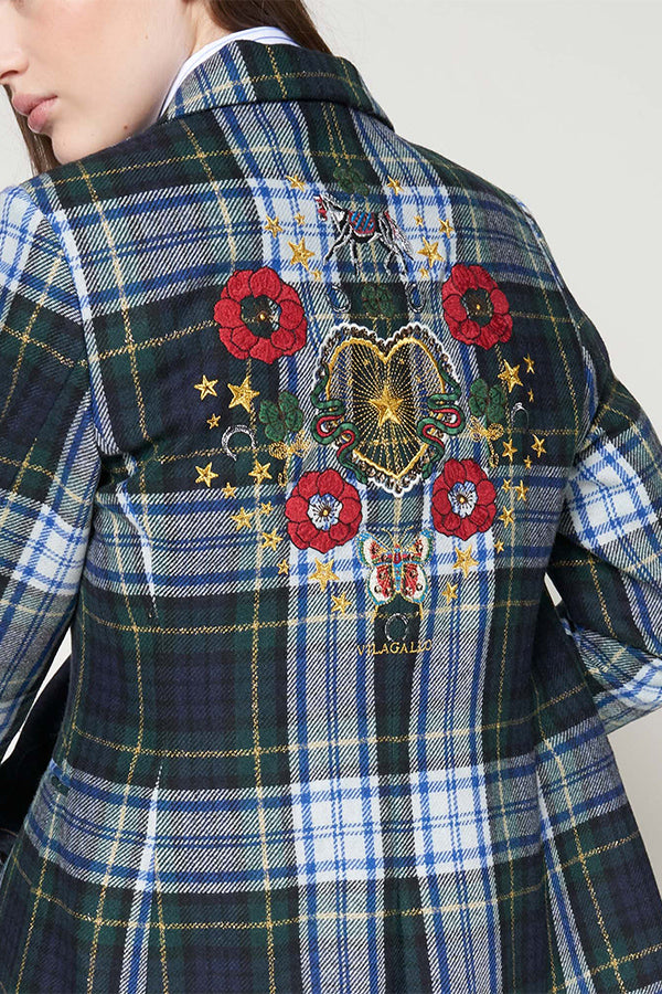 Structured tartan jacket in green, navy and white with gold accents. The back features an elaborate equestrian embroidery with horses, hearts, flowers and stars. Tailored straight cut with classic lapels and single front button closure. Made from a wool blend. Printed inner lining and decorative red hearts on the collar