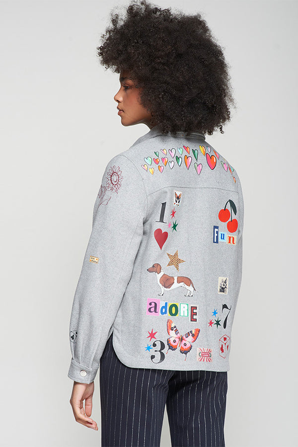 Grey jacket featuring printed illustrations across the front, back and sleeves. Made from a wool blend. Shirt collar and central button closure. Flap pockets on the lower front. Rounded hem at the sides. Long sleeves with buttoned cuffs.
