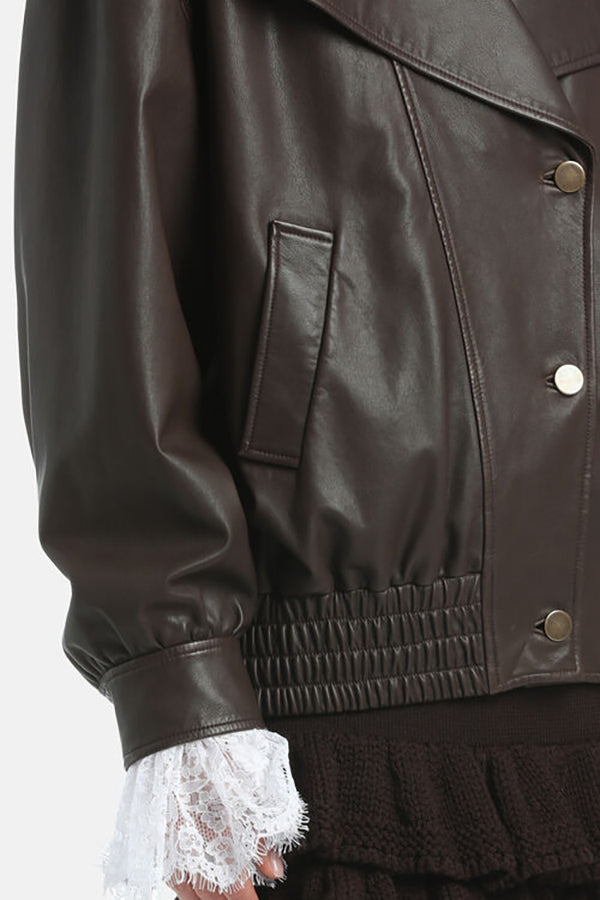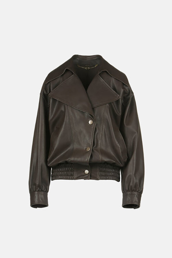 Aviator jacket in genuine leather. Features wide lapels, double-breasted closure with antique metal stud buttons, side pockets, and an elasticated hem. Regular fit. Fashion Show