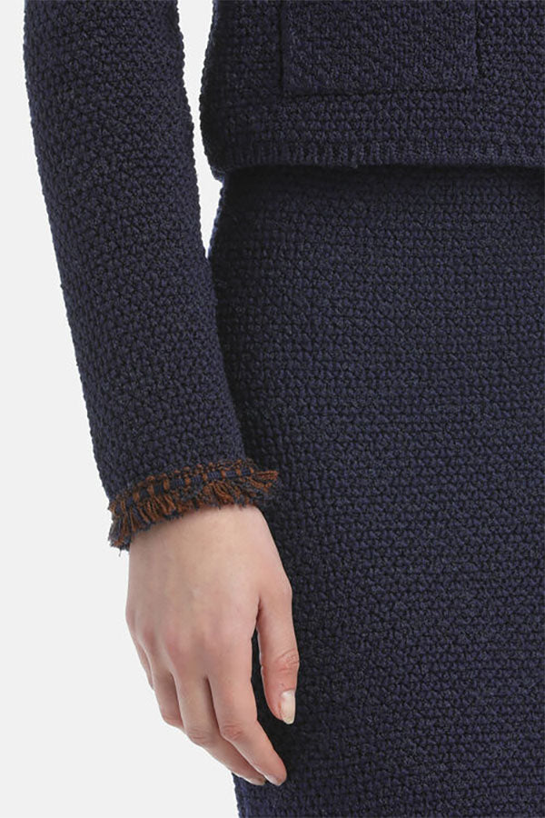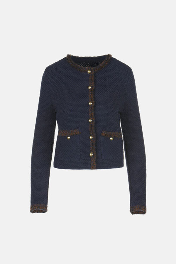 Elegant cardigan made from a wool-blend knit. Defined edges with contrasting fringed trim, rounded gold buttons, and patch pockets. Cropped length. Regular fit.