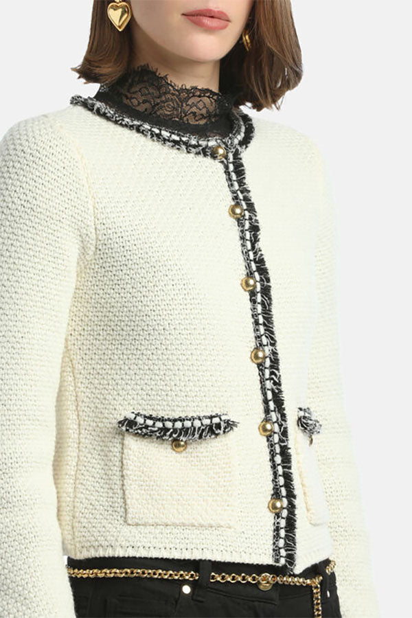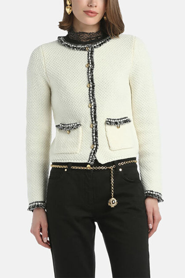 Elegant cardigan made from a wool-blend knit. Defined edges with contrasting fringed trim, rounded gold buttons, and patch pockets. Cropped length. Regular fit.