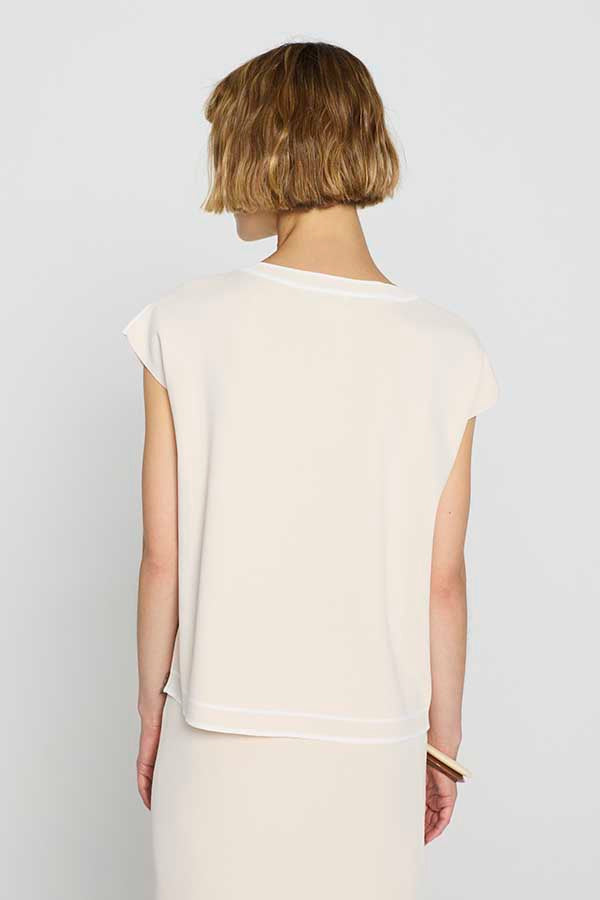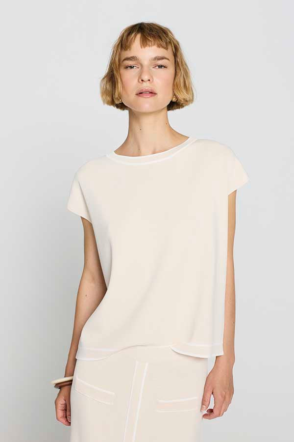 The sleeveless Alessa top, vest-style and made from Milano knit, stands out for its structured, modern design. The boat neckline enhances the shoulder line, which is brought forward for a more contemporary finish. As a distinctive detail, it features decorative buttons on the shoulders that add an elegant and subtle touch.