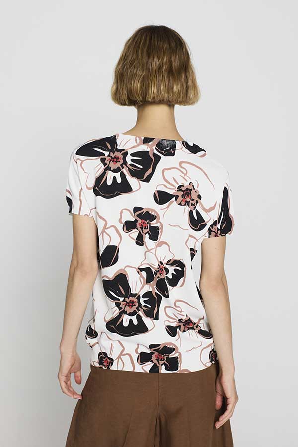 The Siena top, with short sleeves in soft tricot, stands out for its relaxed fit and delicate floral print. Ideal for adding a feminine and fresh touch to your everyday looks.