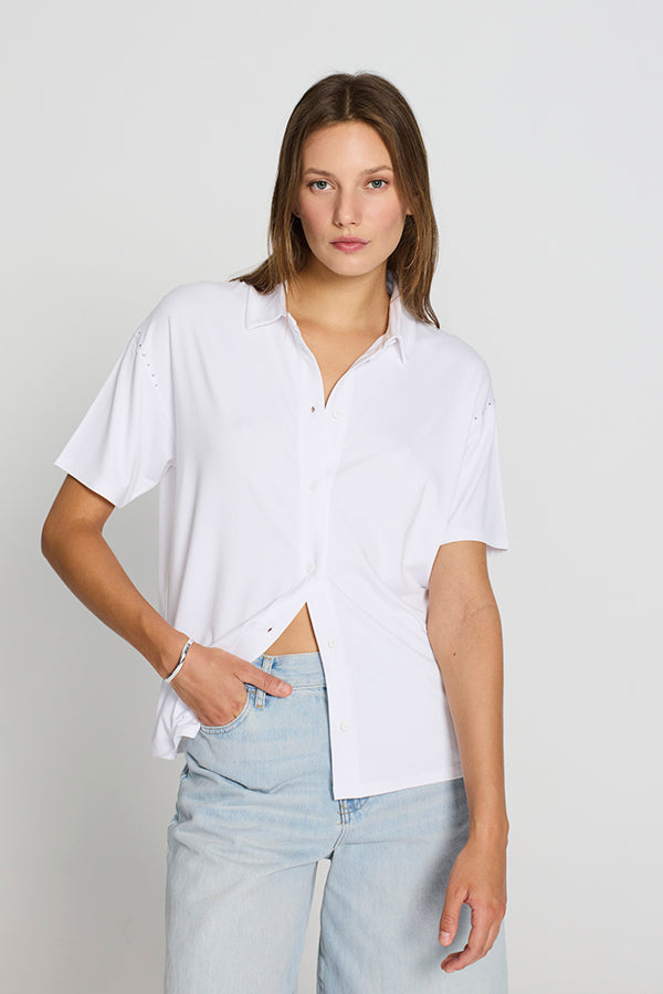 A touch of light in every detail. The Linette viscose shirt, lightweight and with an elegant drape, combines the comfort of the fabric with a sophisticated design. The hotfix-decorated shoulders add a subtle sparkle that elevates the look without detracting from its versatility. With a classic collar and front button placket, it is perfect for wearing from work to dinner, always in style.