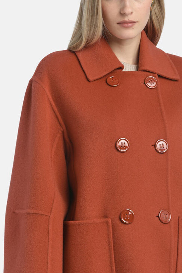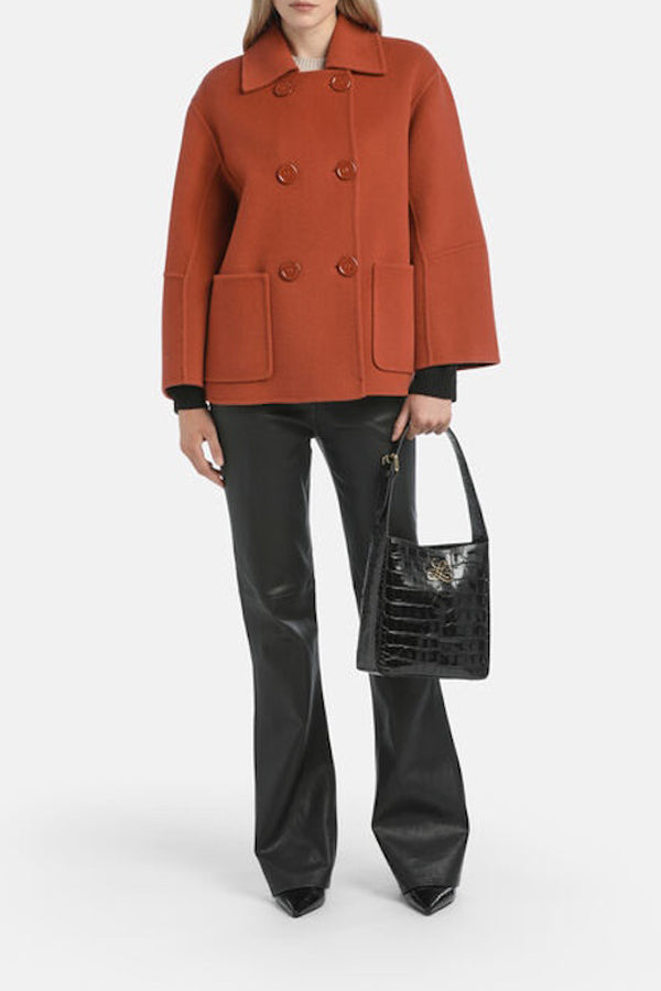 Wool jacket with a double-breasted silhouette. Features tone-on-tone buttons, patch pockets, and slightly flared sleeve hems. Dropped shoulders and matching-fabric intarsia at the sleeve ends. Regular fit.