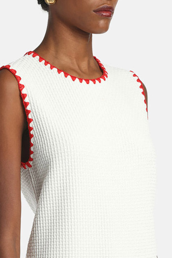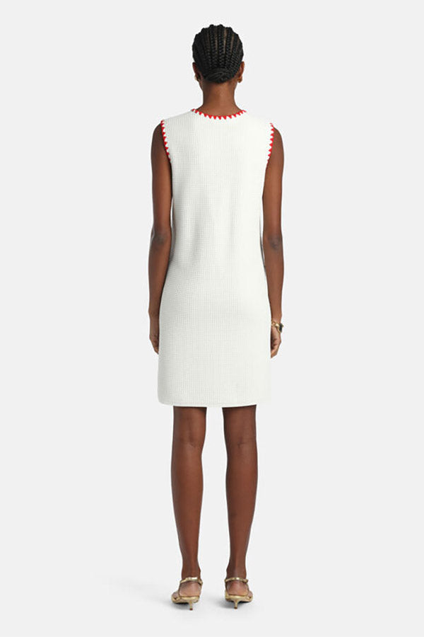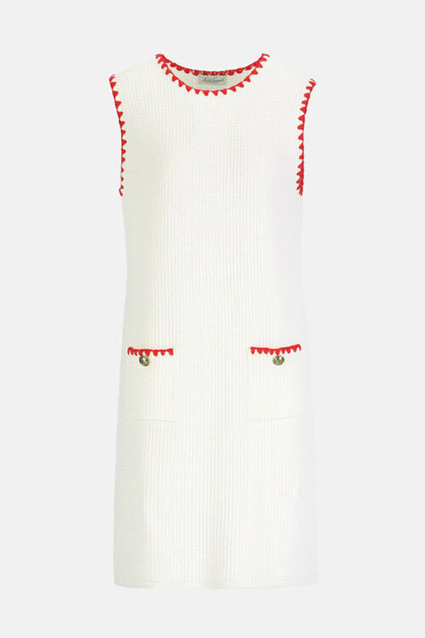 Sleeveless minidress in a viscose blend with a square-stitch pattern. It features a sack silhouette, contrast fan-embroidered trims, a round neckline, and patch pockets with "LS" heraldic buttons. Above-knee length. Regular fit. Made in Italy.