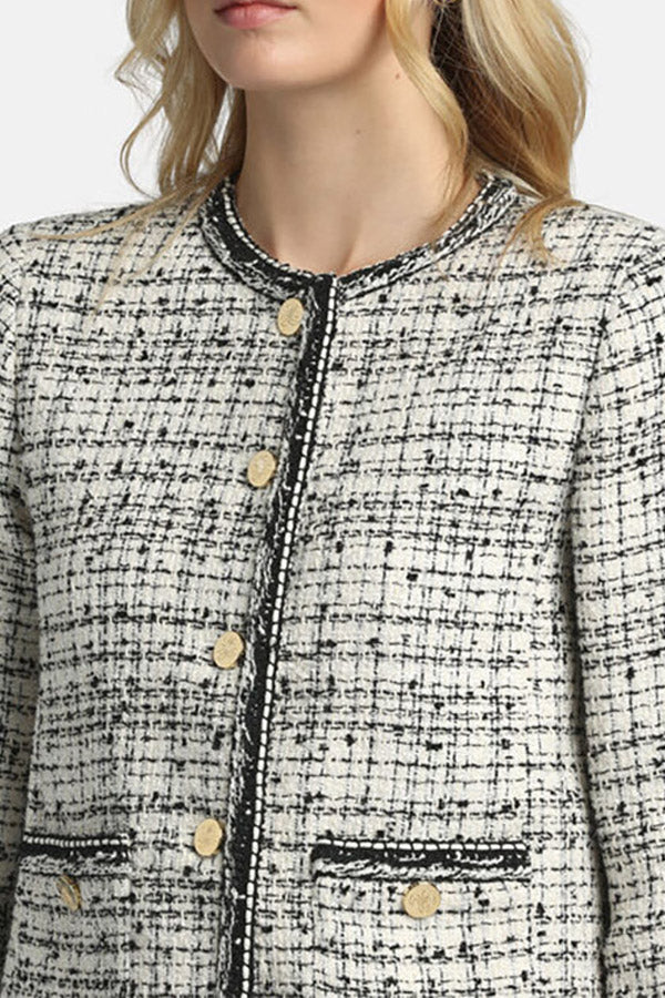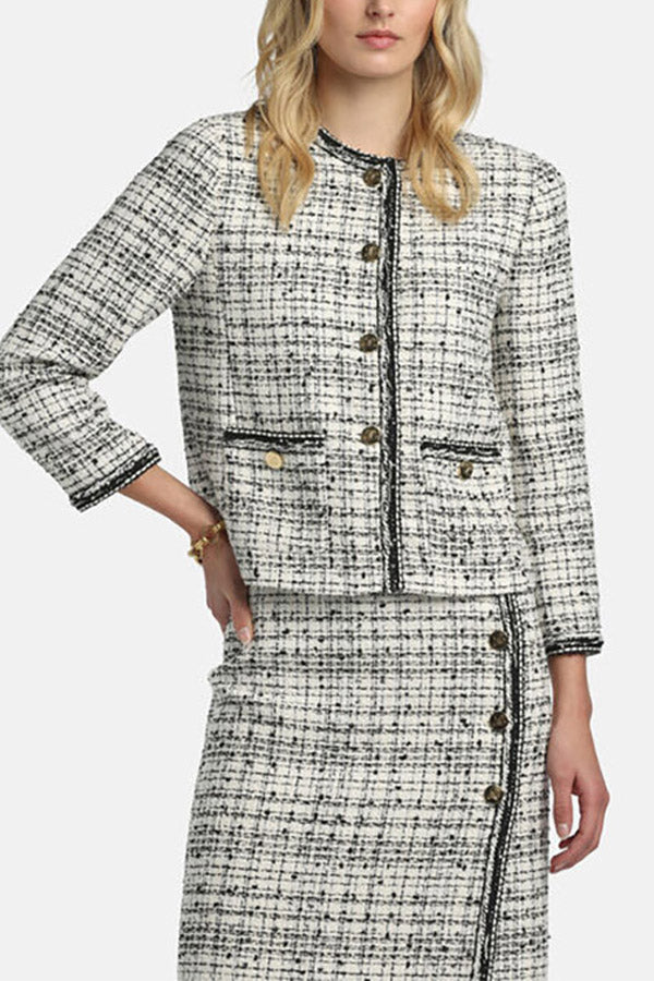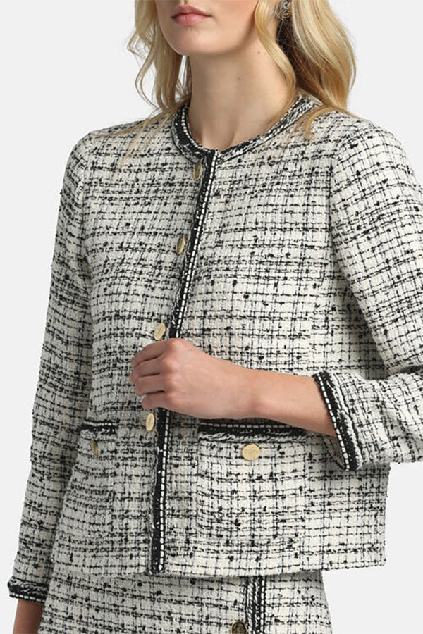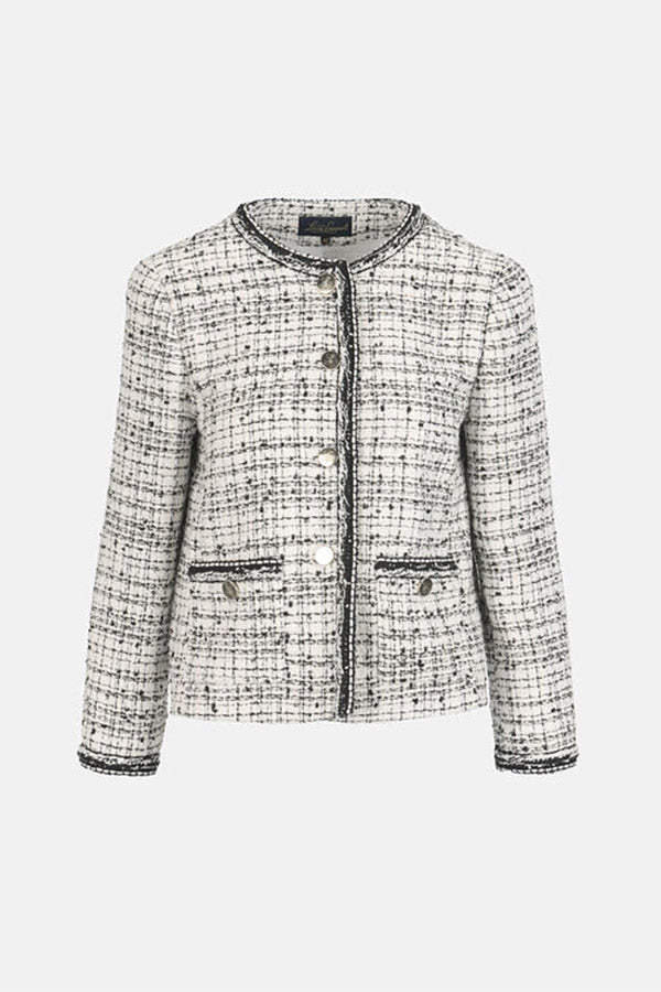 Bon-ton cotton and viscose-blend bouclé jacket with a round neckline, fringed trims, gold-tone "LS" flat buttons, and patch pockets. Cropped-in-length. Regular fit.