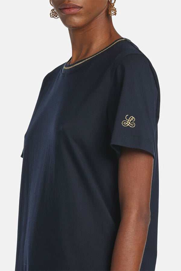 Pure cotton short sleeve T-shirt illuminated with a lurex-thread ribbed band around the crew neckline. Features a small gold-tone logo on the left sleeve. Regular fit.
