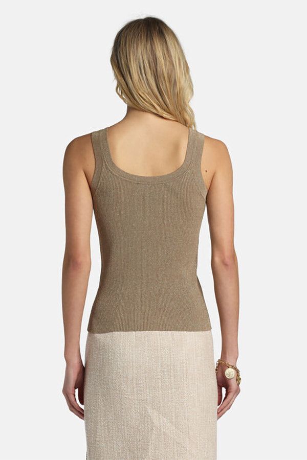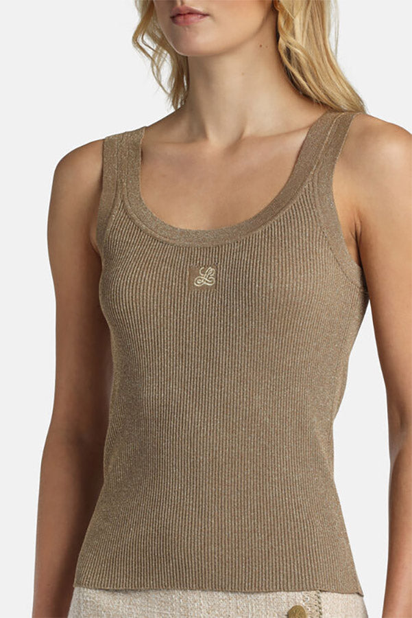 Sleeveless viscose-blend knit top illuminated with lurex threads, featuring a central script "LS" embroidery, a wide round neckline at the front and back, and a striped pattern. Slim fit. Made in Italy.