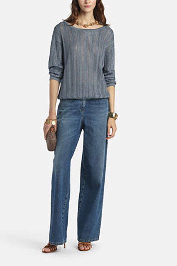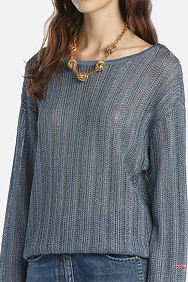 Metallic-finish viscose knit sweater featuring openwork rib knit, a notch neckline, and dropped shoulders. Regular fit. Made in Italy.