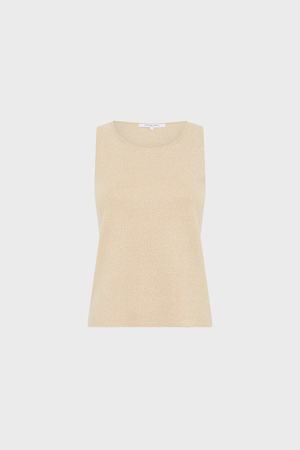 This gold microfiber top is distinguished by its slim fit.