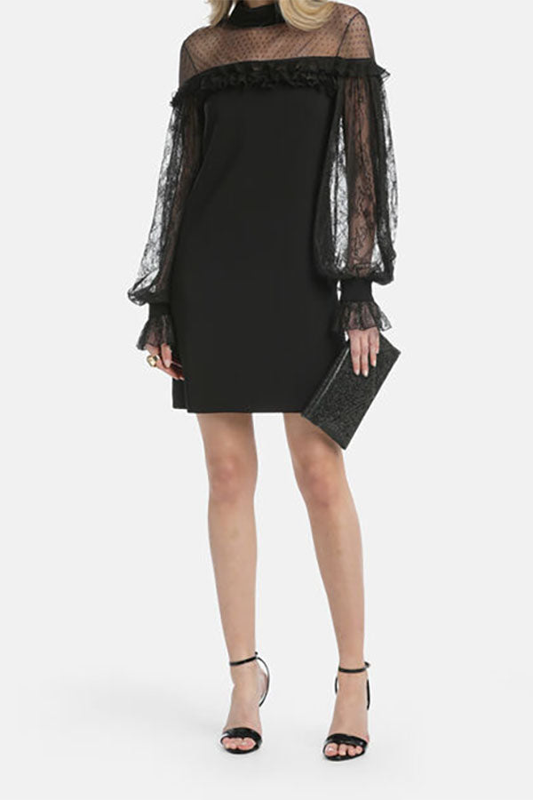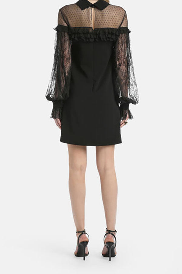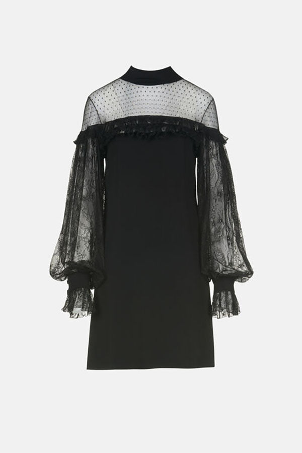 Elegant viscose-blend dress featuring a back collar, point d'esprit tulle and lace inserts. Delicate ruffles on the chest, puffed sleeves with cuffs, and flounced hems. Above-the-knee length. Regular fit.
