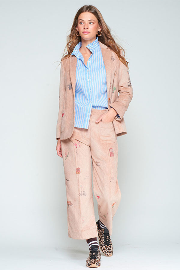 Wide-leg nude corduroy trousers with motifs print inspired by Madrid’s Retiro Park. Belt loops, zip and button closure, side and back pockets. Soft stretch fabric.