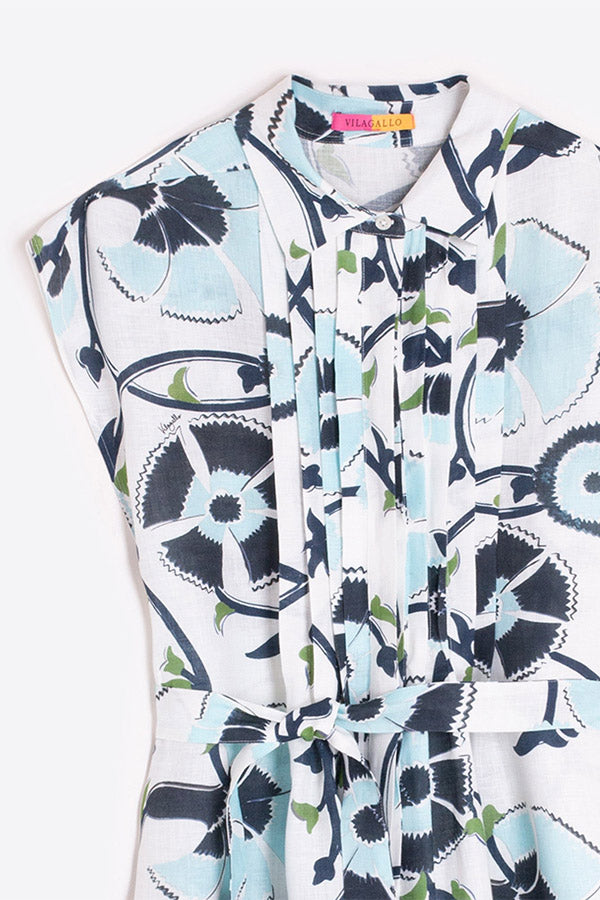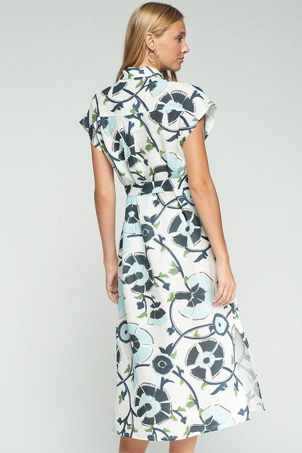 BLUE AND GREEN FLORAL PRINT LINEN SHIRT-DRESS