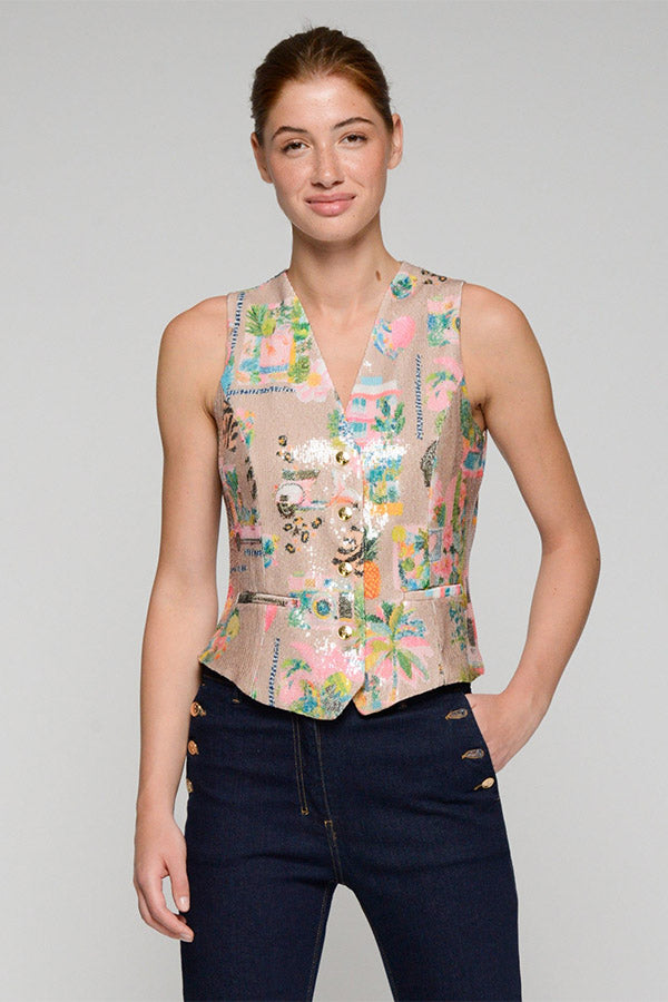 Sequin vest with California print. V-neck and front closure with gold buttons. Welt pockets and pointed hem. Fitted silhouette and plain lining.