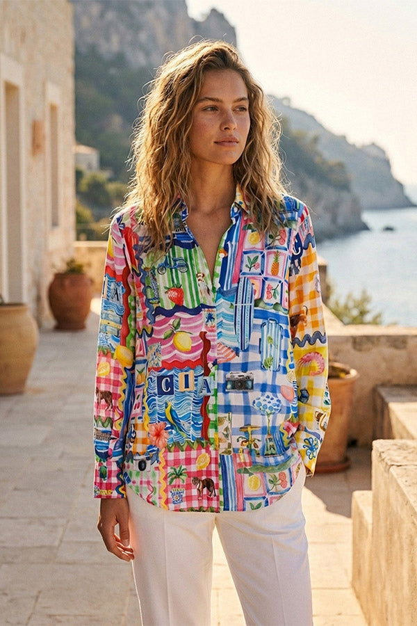 Capri-print shirt with summer-inspired motifs. Shirt collar, button-front closure, long buttoned sleeves, and rounded hem.