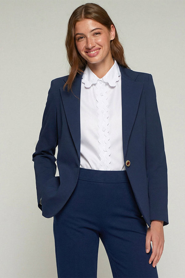 Navy blue jacket with classic lapel, single-button front closure, and patch pockets. Interior with illustrated lining.