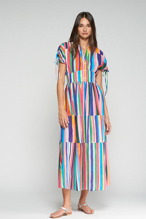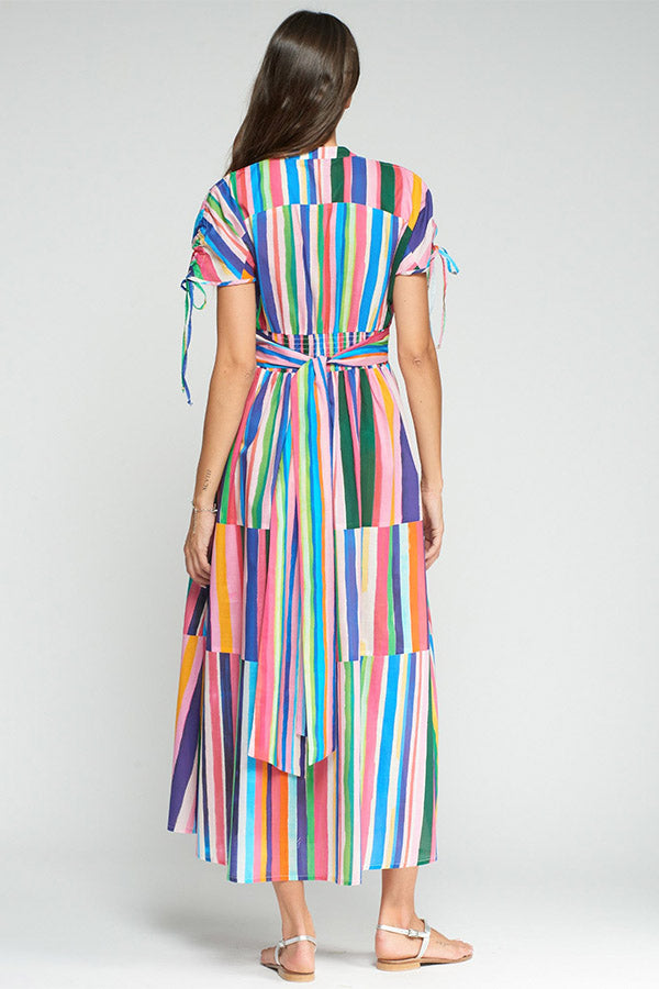 Long dress with multicolored stripes. V-neck with buttons, short sleeves with ties, and a defined waist. Ruffled skirt.