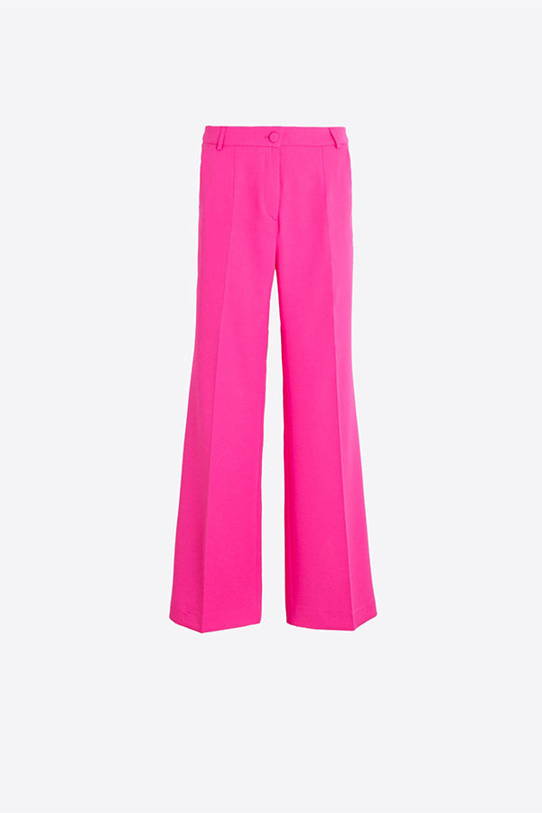 Crepe trousers in fluorescent pink. Mid-rise with front zip and matching covered button, belt loops.
