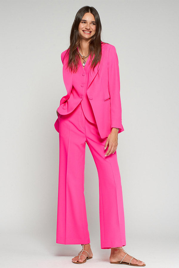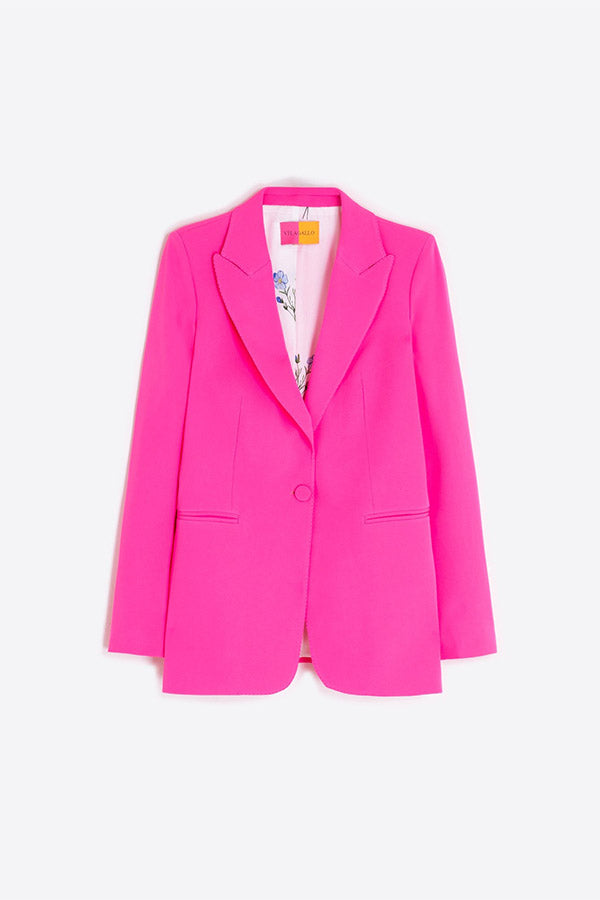 Fuchsia structured jacket with classic lapel and single-button front closure with matching cover. Welt pockets and illustrated lining.