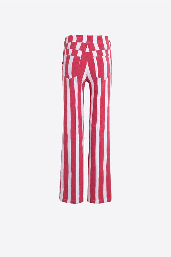 Straight-leg trousers with a red and white vertical stripe print. They feature decorative buttons down both sides of the waistband and a slightly flared leg