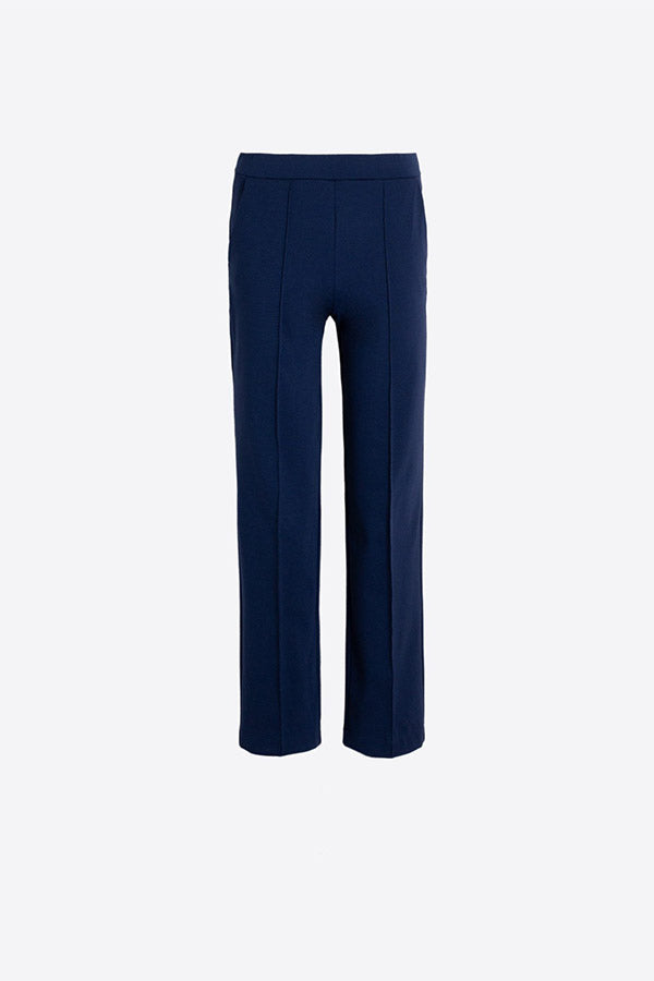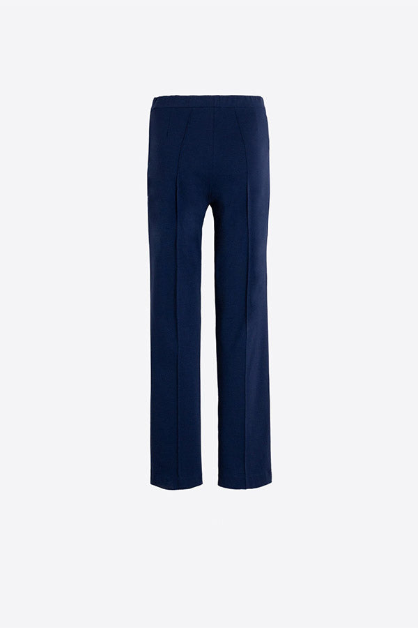 Navy trousers with a straight cut, a smooth waistband, and marked vertical lines on the front.