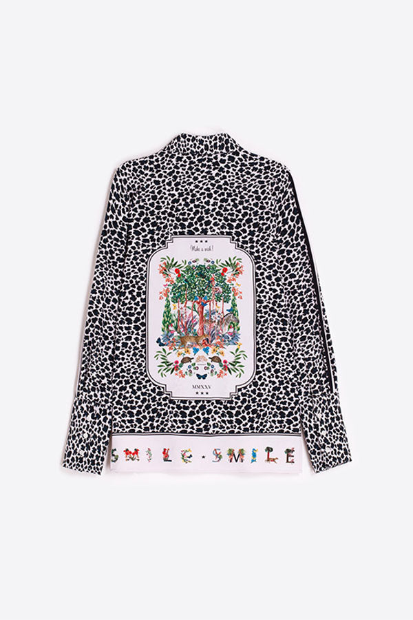 White-based shirt with black leopard print. Back panel features a framed central illustration and repeated “Smile” lettering along the hem. Black stripe with white line runs down the sleeves. Classic collar and front button closure. Long straight sleeves with simple cuffs. Flowing satin fabric.