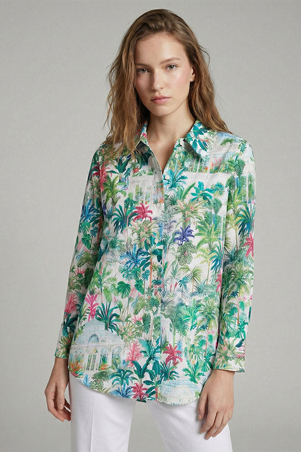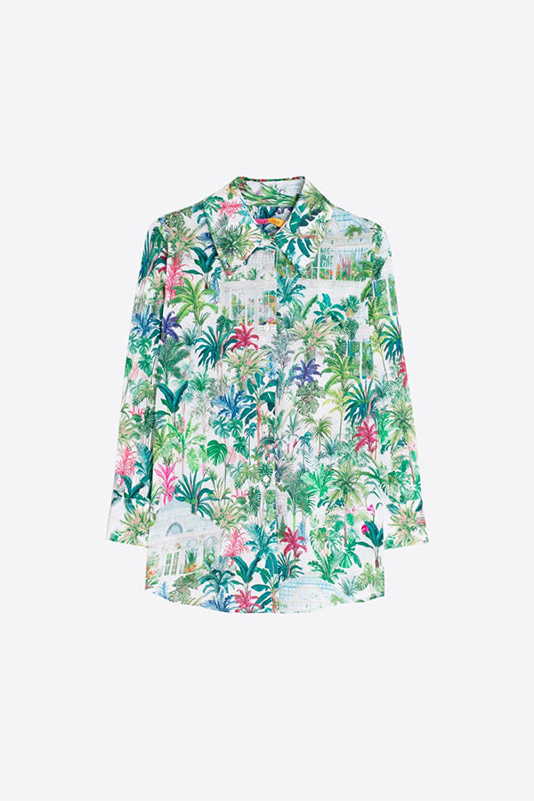 Shirt with a print of greenhouses and tropical plants. Shirt collar, button front closure and long sleeves. Straight hem.