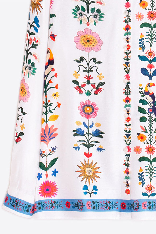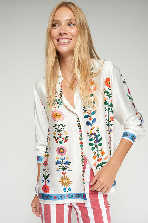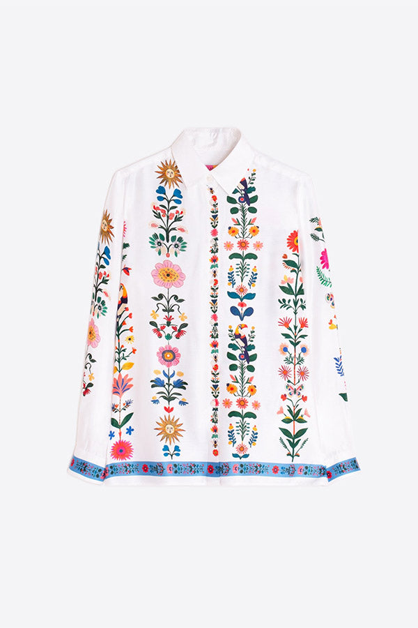 Straight-cut shirt with a classic collar and button-front closure. Features a multicolored floral stripe print across the front, sleeves, and back. A blue floral-patterned trim adorns the hem. Long sleeves with buttoned cuffs and a straight hem.