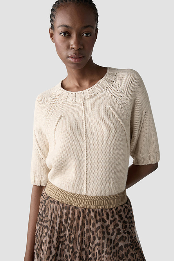 WHITE RIBBED SHORT SLEEVE KNIT SWEATER